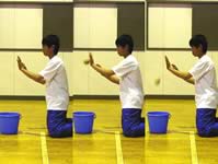 軽くトスされたボールを手のひらで受け止めてすぐ目の前のバケツにはじいて落とします。
