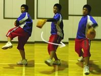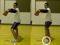 実際には着地のときには、写真の右側のように足の先は投球方向を向きますが、イメージとしては、着地の直前まで横を向いているイメージを作ってください。
