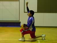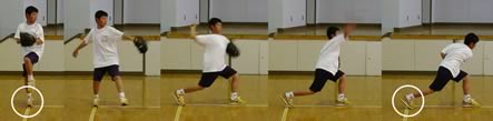 写真のように、軸足を地面につけたまま出来るだけ最初の位置から動かないようにして、投げる練習を紹介します。